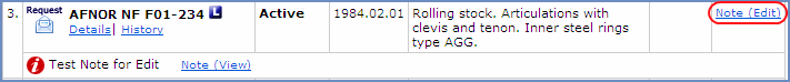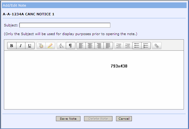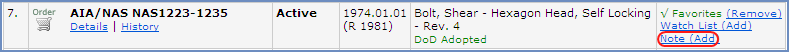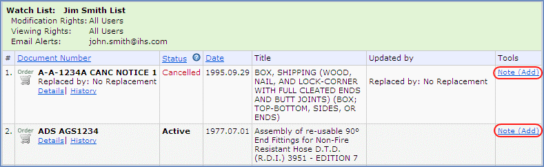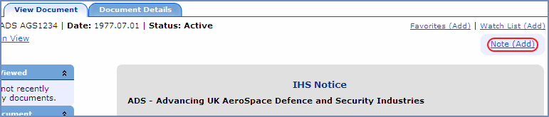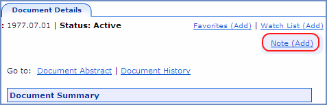 Administrators can add an Account Note from the Search Results, Document Details, View Document, or Watch List Results pages. A Note (Add) link in the Tools column opens a display where a note can be added to a specific document.