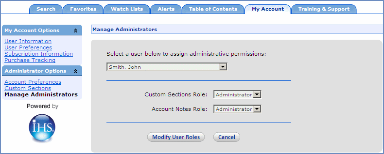 Each subaccount in your general account that uses the Account Notes feature and Custom Sections, must have one or more Administrators assigned. From the My Account tab/page, Administrators can select the Manage Administrators link to assign or remove administrative permissions for the Custom Sections Role and the Account Notes Role.