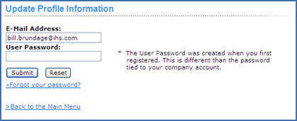 To update profile information from the Engineering Resource Center (ERC), simply log in and on the Main Menu screen, click the Update your profile link. To update profile information from the Main Menu, simply log in and click the Update your profile link. On the next screen, enter your new email address and/or password, and then click Submit.
