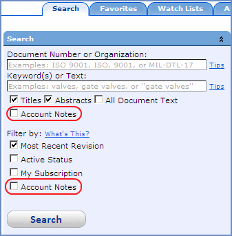 For users of subaccounts that contain the Account Notes feature, the Account Notes search field appears twice on the Search tab/pane. The first field is displayed with a checkbox under the Keywords search feature. If this Account Notes checkbox is checked, then the checkboxes for Titles, Abstracts, and All Document Text are disabled, and only the text that includes the subject and body of Account Notes is searched.
